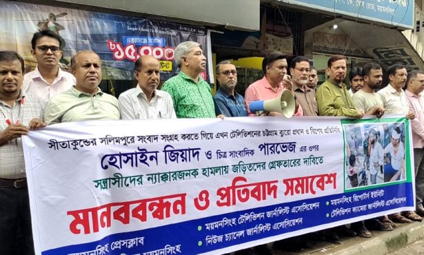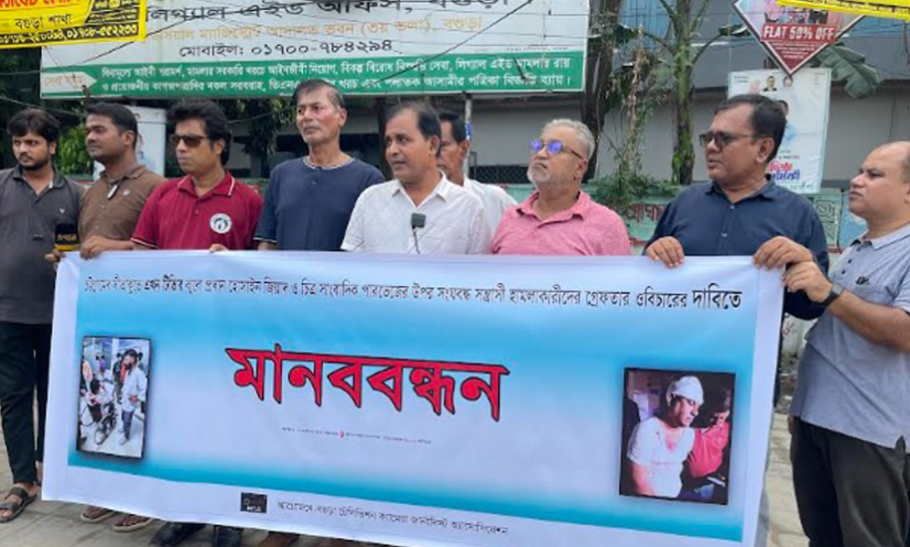 বগুড়া: এখন টিভির চট্রগ্রাম ব্যুরো প্রধান হোসাইন জিয়াদ এবং ক্যামেরাপার্সন পারভেজের ওপর হামলার ঘটনায় জড়িতদের অবিলম্বে গ্রেফতার ও বিচারের দাবিতে বগুড়ায় মানববন্ধন করেছেন স্থানীয় ইলেকট্রনিক্স ও প্রিন্ট মিডিয়ার সাংবাদিকেরা।