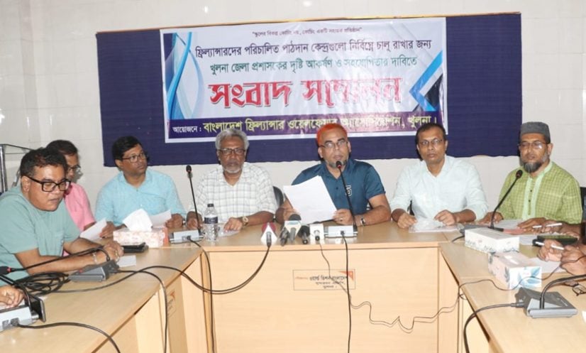 খুলনা: জেলা প্রশাসকের সাম্প্রতিক নির্দেশনা/আদেশ শিক্ষিত বেকার সমাজকে নতুনভাবে অনিশ্চয়তায় ঠেলে দিয়েছে উল্লেখ করে ফ্রিল্যান্সার পরিচালিত পাঠদান কেন্দ্রগুলো নির্বিঘ্নে চালু রাখার দাবিতে সংবাদ সম্মেলন করেছেন ফ্রিল্যান্সাররা। মঙ্গলবার (৭ অক্টোবর) দুপুরে খুলনা প্রেসক্লাবে আয়োজিত সংবাদ সম্মেলনে তারা এ দাবি জানান।