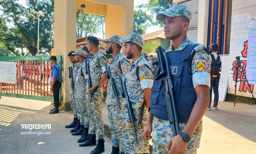 ভোটদানের পরিবেশ নির্বিঘ্ন রাখতে নিয়োজিত আইনশৃঙ্খলা বাহিনী। ছবি: সারাবাংলা