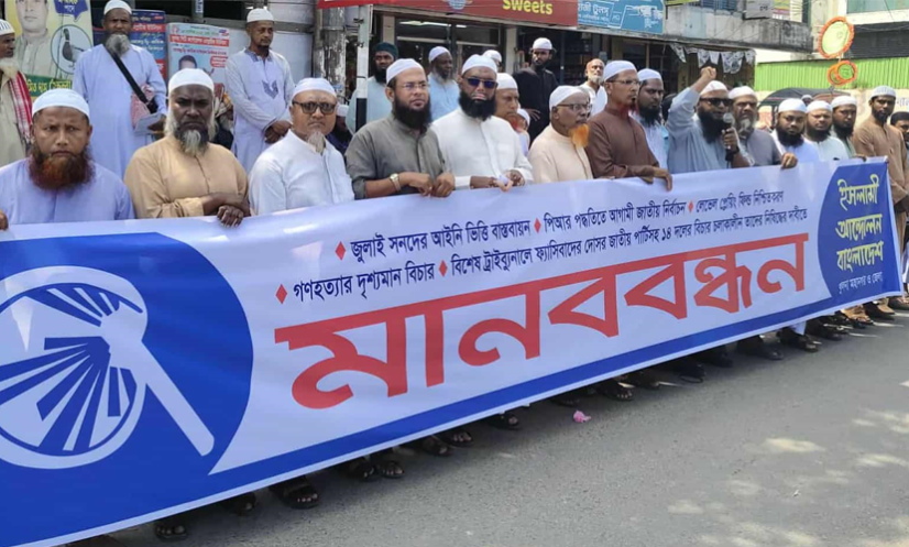 জুলাই সনদের ভিত্তিতে পিআর পদ্ধতিতে জাতীয় নির্বাচন আয়োজন, নির্বাচনে লেভেল প্লেয়িং ফিল্ড নিশ্চিত করা, গণহত্যার বিচার ও ফ্যাসিবাদের দোসরদের বিচারের আওতায় আনা এবং বিচারকালীন তাদের কার্যক্রম নিষিদ্ধ ঘোষণার দাবিতে ইসলামী আন্দোলন বাংলাদেশের ঘোষিত কেন্দ্রীয় কর্মসূচির অংশ হিসেবে খুলনা নগরীর পাওয়ার হাউজ মোড়ে এই মানববন্ধন অনুষ্ঠিত হয়।
