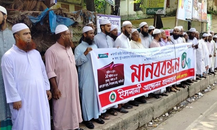 বুধবার (১৫ অক্টোবর ) দুপুরে নরসিংদী প্রেসক্লাবের সামনে ইসলামী আন্দোলন বাংলাদেশ নরসিংদী জেলা শাখা এই মানববন্ধনের আয়োজন করে।