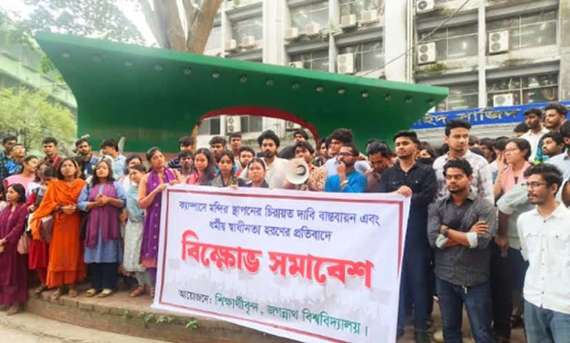 জবি: জগন্নাথ বিশ্ববিদ্যালয়ের (জবি) সনাতন ধর্মাবলম্বী শিক্ষার্থীদের দীর্ঘদিনের ‘প্রাণদাবি’ ক্যাম্পাস প্রাঙ্গণে একটি স্থায়ী মন্দির স্থাপন। এর দাবিতে বিক্ষোভ সমাবেশ করেছেন সনাতনী শিক্ষার্থীরা।