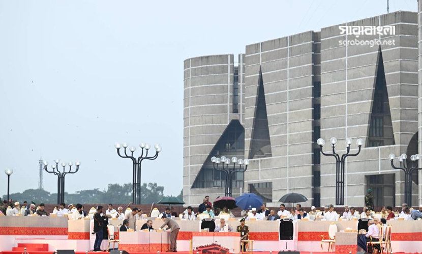 এর আগে সকাল ১০টার দিকে কয়েকশ ‘জুলাই যোদ্ধা’ সংসদ ভবনের বাউন্ডারি পেরিয়ে মূল অনুষ্ঠানস্থলে প্রবেশ করে অতিথিদের আসনে বসে পড়েন। পুলিশ তাদের সরাতে গেলে উভয় পক্ষের মধ্যে কথা-কাটাকাটি ও ধাক্কাধাক্কির পর সংঘর্ষ ছড়িয়ে পড়ে।
