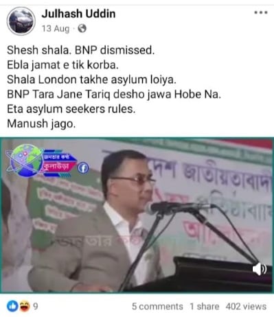 ১৩ আগষ্ট অপর একটি পোস্টে তারেক রহমানের একটি ভিডিও শেয়ার করে লিখেছিলেন – ‘শেষ শালা! বিএনপি ডিসমিস। এবার জামায়াতে ঠিক করবে; শালা লন্ডন থেকে এসাইলাম লইয়া, বিএনপি তারা জানে তারেক দেশে যাওয়া হবে না। এটা এসাইলাম সিকারস রুলস, মানুষ জাগো।’