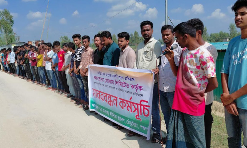 শনিবার (১৮ অক্টোবর) দুপুরে দেবনগড় ইউনিয়নের বাংলাচন্ডী এলাকায় এই মানববন্ধন কর্মসূচি পালন করে তারা।