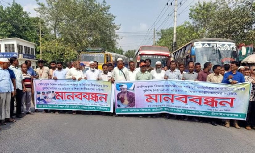 রোববার (১৯ অক্টোবর) সকাল সাড়ে ১০টায় শহরের বিশ্বরোড মোড়ে শাহ নেয়ামতুল্লাহ কলেজ সংলগ্ন এলাকায় জেলা কলেজ শিক্ষক কর্মচারী কল্যাণ সমিতি (নজেকশিস), চাঁপাইনবাবগঞ্জ জেলা শাখার উদ্যোগে এ মানববন্ধনের আয়োজন করা হয়।