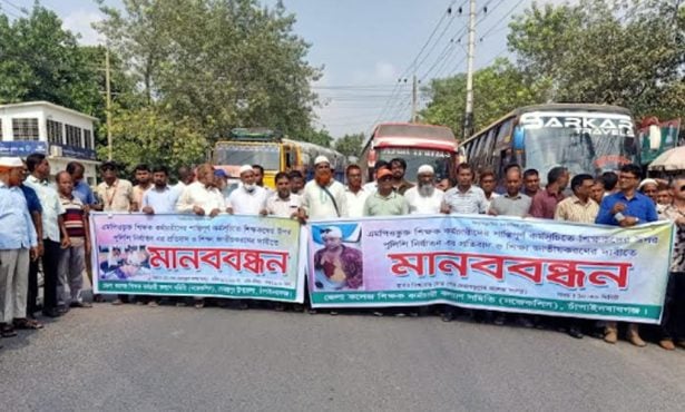 সোমবার (২০ অক্টোবর) দুপুরে বিদ্যালয় প্রাঙ্গণে এ মানববন্ধনের আয়োজন করেন বিদ্যালয়ের বর্তমান ও প্রাক্তন শিক্ষার্থী এবং স্থানীয় এলাকাবাসী।