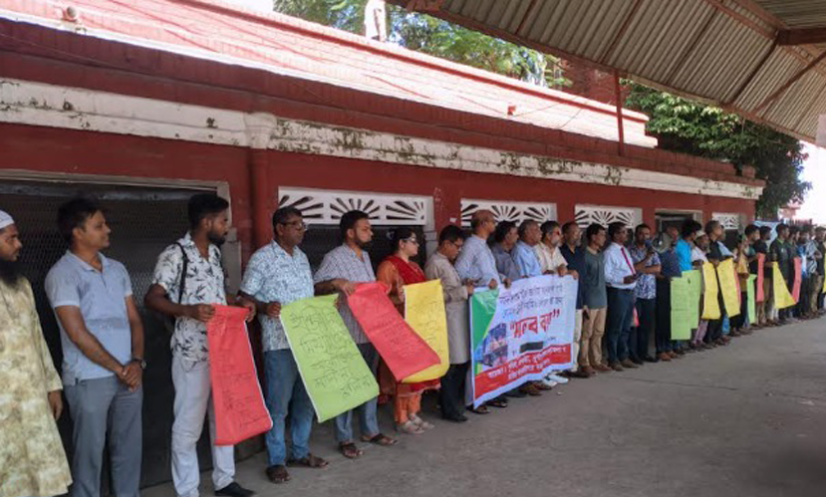 সোমবার (২০ অক্টোবর) দুপুরে এই মানববন্ধনে বিপুল সংখ্যক মানুষের পাশাপাশি সাধারণ যাত্রীরাও অংশ নেন।