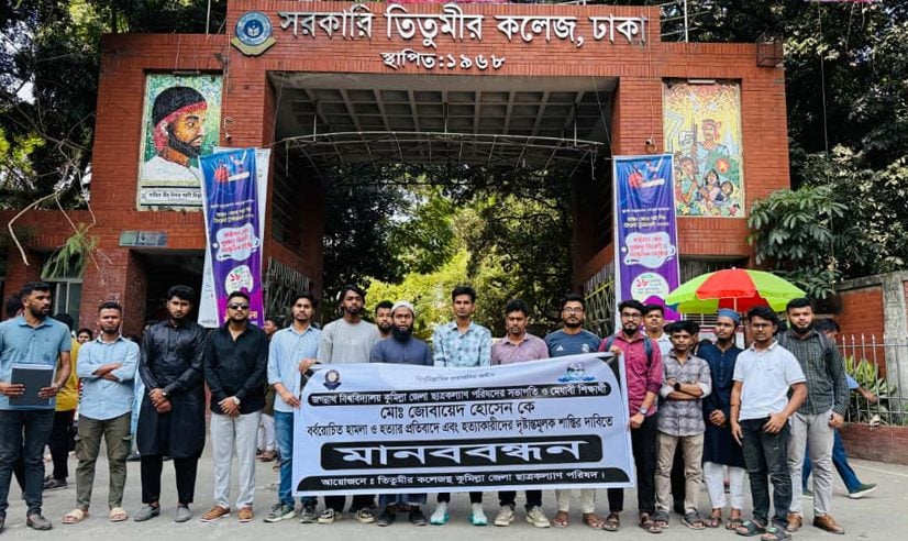 আজ (মঙ্গলবার) দুপুরে কলেজের প্রধান ফটকের সামনে এই মানববন্ধন কর্মসূচি অনুষ্ঠিত হয়। এতে অংশ নেন তিতুমীরস্থ কুমিল্লা জেলা ছাত্রকল্যাণ পরিষদের বর্তমান ও সাবেক শিক্ষার্থীরা। তাঁরা জোবায়েদ হোসেনের হত্যাকারীদের দ্রুত গ্রেপ্তার ও দৃষ্টান্তমূলক শাস্তির দাবি জানান।