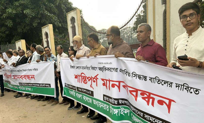 ঢাকা: টাঙ্গাইল জেলাকে ময়মনসিংহ বিভাগে অন্তর্ভুক্ত করার প্রস্তাবনার প্রতিবাদে মানববন্ধন করেছে বিভিন্ন রাজনৈতিক, সামাজিক ও পেশাজীবী সংগঠনের প্রতিনিধিরা।
