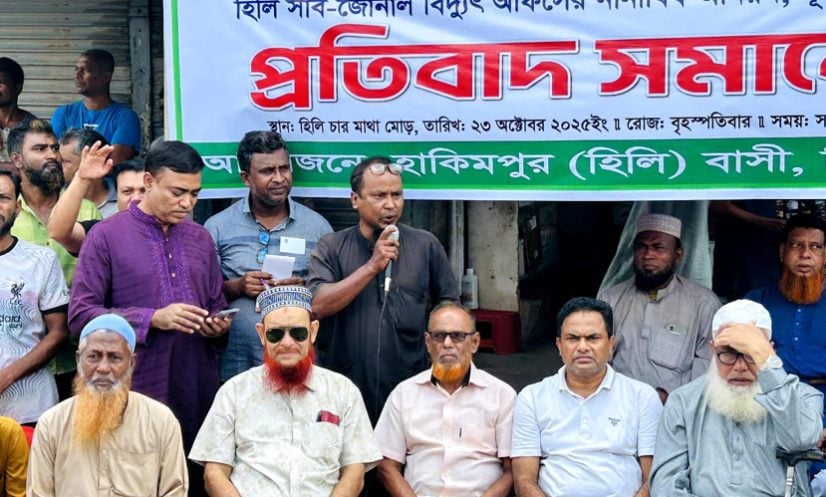 বৃহস্পতিবার (২৩ অক্টোবর) হিলি স্থলবন্দরের চারমাথা মোড়ে হাকিমপুর উপজেলার সর্বসাধারণের ব্যানারে এই প্রতিবাদ সমাবেশ অনুষ্ঠিত হয়েছে।