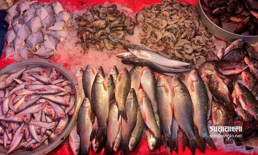 বাজারে মাছের বাড়তি দর এখনও নিম্নমুখী হয়নি। বড় সাইজের বাগদা প্রতি কেজি ৯০০ টাকা, গলদা চিংড়ি ৮৫০ ও ছোট চিংড়ি ৭০০ টাকায় বিক্রি হচ্ছে। বড় রুই ৪৫০ থেকে ৫৮০ টাকা, মাঝারি ৪৬০ টাকা ও ছোট রুই ৩৬০ টাকা কেজি দরে বিক্রি হচ্ছে। কাতলা মাছ ৩৬০ থেকে ৪৫০ টাকায় বিক্রি হচ্ছে। এছাড়া ছোট কোরাল মাছ ৭০০ থেকে ৯০০ টাকা, তেলাপিয়া ২৫০ টাকা, সিলভার কার্প ২৫০, পাবদা ৪০০, রূপচাঁদা ৮৫০ ও টেংরা ৮০০ টাকা কেজি দরে বিক্রি হচ্ছে।