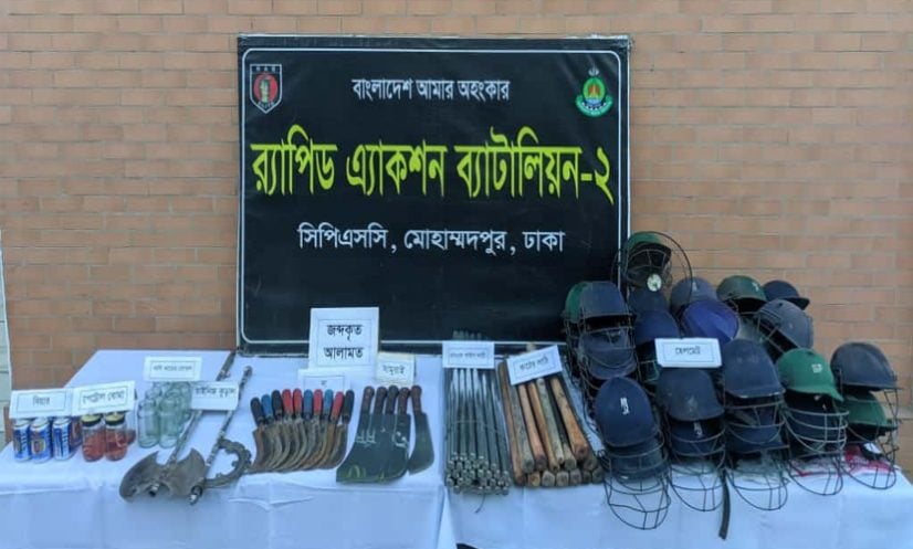 অভিযানে পরিত্যক্ত অবস্থায় ১টি বিদেশী পিস্তল, ১টি ম্যাগাজিন এবং ৩ রাউন্ড তাজা গুলি, ৫টি সামুরাই, ১০টি লোহার দা, ২টি চায়নিজ কুড়াল, ৪টি পেট্রোল বোমা, ১০টি পেট্রোল বোমা তৈরির জন্য ব্যবহৃত খালি কাঁচের বোতল, ১০টি হান্টার বিয়ার ক্যান, ৩৩টি এসএস পাইপ এর লাঠি, ১৪টি কাঠের লাঠি, ৩০টি পুরাতন হেলমেট উদ্ধার করা হয়।