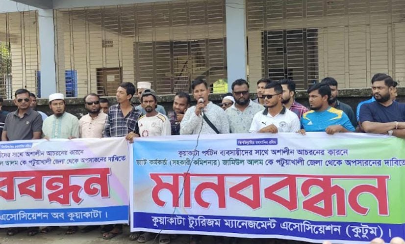 পটুয়াখালী: কুয়াকাটা পর্যটন ব্যবসায়ীদের সঙ্গে অশালীন আচরনের কারণে ভ্যাট কর্মকর্তা জামিউল আলমকে অপসারনের দাবিতে মানববন্ধন করেছে ব্যবসায়ীরা।