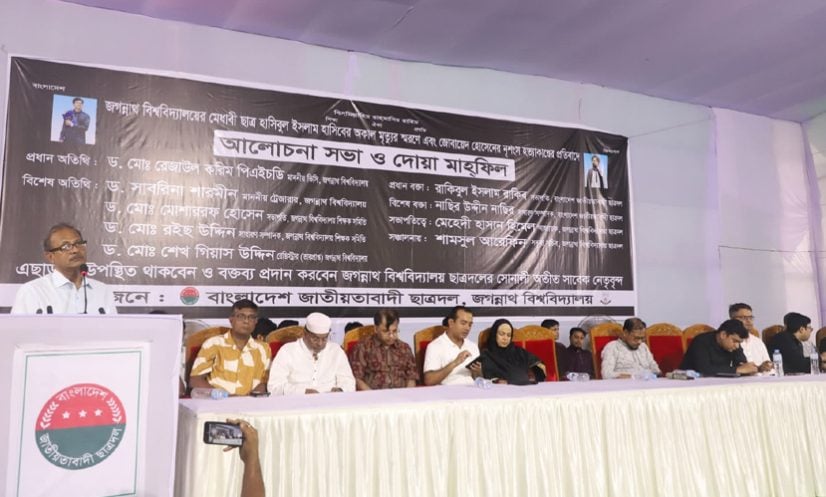 রোববার (২৬ অক্টোবর) বিশ্ববিদ্যালয়ের বিজ্ঞান ভবন প্রাঙ্গণে হাসিবুল ইসলাম অকাল মৃত্যু ও জুবায়েদ হত্যার প্রতিবাদে আলোচনা সভা ও দোয়া মাহফিল অনুষ্ঠানে তিনি এ কথা বলেন।