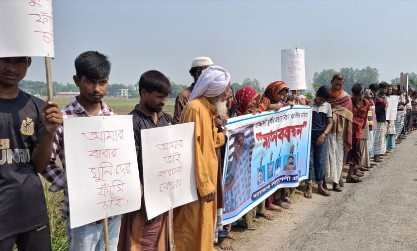 এ সময় বক্তব্য দেন, নিহতের মেঝো ভাই ইউনুস আলী, হারিম মুনসি, নিহতে স্ত্রী শিউলি বেগম, মা বেলি খাতুনসহ অনেকে। মানববন্ধন শেষে একটি বিক্ষোভ মিছিল স্থানীয় সড়ক প্রদক্ষিণ করে।