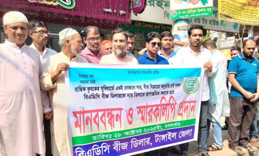 টাঙ্গাইল: প্রান্তিক কৃষকদের সুবিধার্থে একই দোকানে সার ও বীজ বিক্রয়ের অনুমতি প্রদানের দাবিতে টাঙ্গাইলে মানববন্ধন কর্মসূচি পালন শেষে স্মারকলিপি জমা দিয়েছেন জেলা বিএডিসি বীজ ডিলাররা।