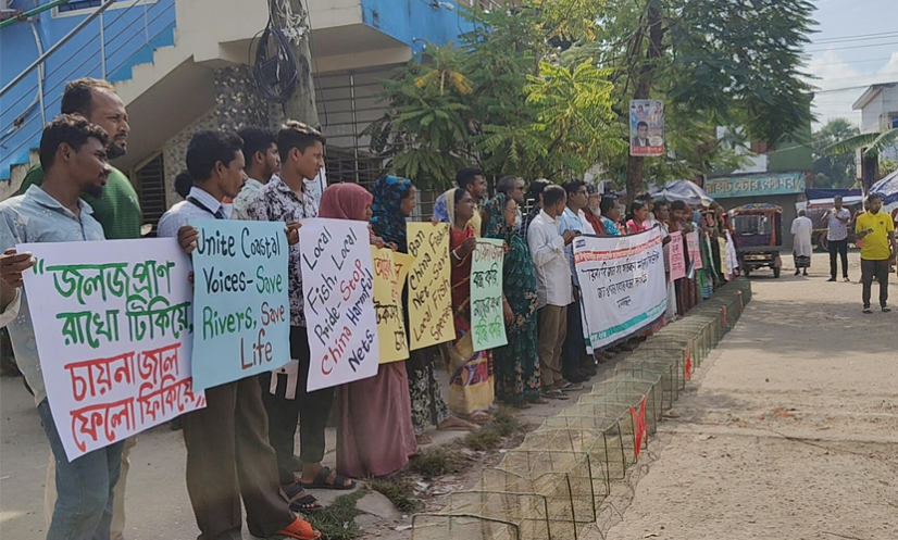সাতক্ষীরা: বাংলাদেশের উপকূলীয় নদ-নদীতে চায়না দুয়ারি জালসহ ক্ষতিকর মাছ ধরার বিদেশি জাল নিষিদ্ধের দাবিতে সাতক্ষীরার শ্যামনগরে মানববন্ধন অনুষ্ঠিত হয়েছে।