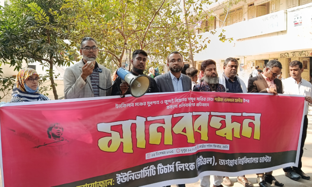 মানববন্ধনে বক্তব্য দেন শিক্ষার্থী জাকির হোসেন, শিহাব উদ-দৌলা, ইশা, তনু প্রমুখ।