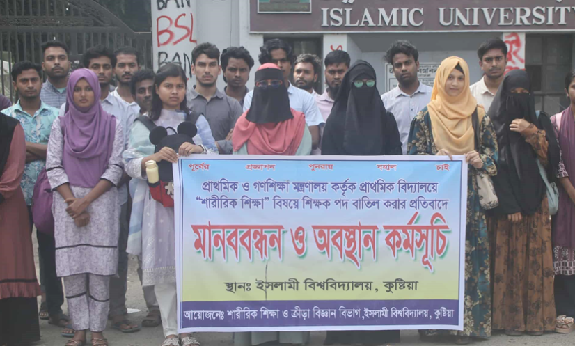 কুষ্টিয়া: সরকারি প্রাথমিক বিদ্যালয়ে ‘শারীরিক শিক্ষা’ বিষয়ের শিক্ষক পদ পুনর্বহালের দাবিতে মানববন্ধন করেছে ইসলামী বিশ্ববিদ্যালয়ের (ইবি) শারীরিক শিক্ষা ও ক্রীড়া বিজ্ঞান বিভাগের শিক্ষার্থীরা।