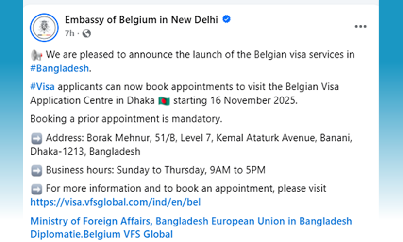 অবশেষে সেই সমস্যার সমাধান হলো। দিল্লিতে অবস্থিত বেলজিয়াম দূতাবাস তাদের অফিসিয়াল ফেসবুক পেজে এক বিজ্ঞপ্তির মাধ্যমে নিশ্চিত করেছে, এখন থেকে দিল্লি নয়, ঢাকাতেই ভিসার আবেদন জমা দিতে পারবেন বাংলাদেশিরা। এই নতুন প্রক্রিয়াটি ১৬ নভেম্বর থেকে শুরু হবে।