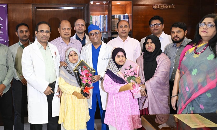 বার্ন অ্যান্ড প্লাস্টিক সার্জারি ইনস্টিটিউটের পরিচালক, চিকিৎসক, নার্স ও কর্মচারীদের সঙ্গে যমজ বোন।