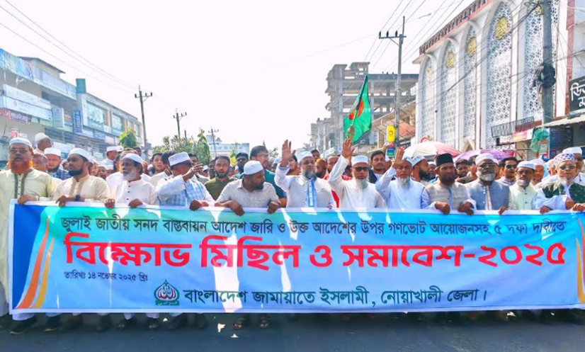 নোয়াখালী: জুলাই জাতীয় সনদ বাস্তবায়নসহ পাঁচ দফা দাবি বাস্তবায়নের আদেশ জারি এবং ওই আদেশের ওপর গণভোট আয়োজনকে কেন্দ্র করে সমাবেশ ও বিক্ষোভ মিছিলের আয়োজন করেছে নোয়াখালী শহর জামায়াত। এসময় সমাবেশে প্রধান অতিথির বক্তব্য দেন বাংলাদেশ জামায়াতে ইসলামী কেন্দ্রীয় সহকারী সেক্রেটারি জেনারেল এটিএম মাসুম।
