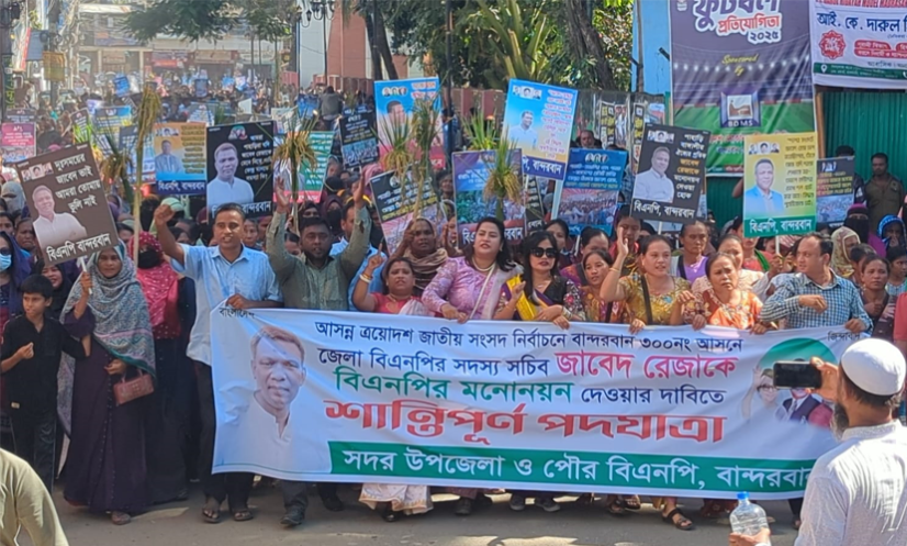 বান্দরবান: আসন্ন ত্রয়োদশ জাতীয় সংসদ নির্বাচনকে সামনে রেখে জাতীয় সংসদের ৩০০ তম আসন বান্দরবানে জেলা বিএনপির সদস্য সচিব জাবেদ রেজাকে দলীয় মনোনয়ন দেওয়ার দাবিতে যৌথভাবে শান্তিপূর্ণ পদযাত্রা করেছে পাহাড়ি–বাঙালিরা।