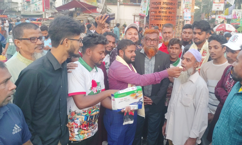 জুলাই যোদ্ধারা সোমবার (১৭ নভেম্বর) বগুড়া শহরের সাতমাথায় সাধারণ মানুষের মাঝে এই মিষ্টি বিতরণ করেন।