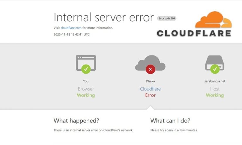 জানা গেছে, ইন্টারনেট অবকাঠামো এবং সুরক্ষা সেবাদাতা সংস্থা ক্লাউডফ্লেয়ারে (Cloudflare) বড় ধরনের প্রযুক্তিগত বিভ্রাট দেখা দেওয়ায় বিশ্বজুড়ে বহু জনপ্রিয় ওয়েবসাইট ও অ্যাপে প্রবেশে সমস্যা সৃষ্টি হয়েছে। সোশ্যাল মিডিয়া প্ল্যাটফর্ম এক্স, চলচ্চিত্র পর্যালোচনাবিষয়ক সাইট লেটারবক্সডসহ অসংখ্য ওয়েবসাইটে প্রবেশের চেষ্টা করলে ব্যবহারকারীরা একটি ত্রুটি বার্তা দেখতে পান। বার্তায় বলা হয়, ‘ক্লাউডফ্লেয়ারের সমস্যার কারণে পেজটি লোড করা সম্ভব হয়নি।’ বাংলাদেশের বহু নিউজ সাইট-ও প্রবেশে সমস্যা হচ্ছে।