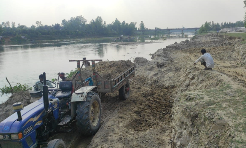 নদীর পাড় ঘেঁষে অবৈধভাবে চলছে বালু উত্তোলন।