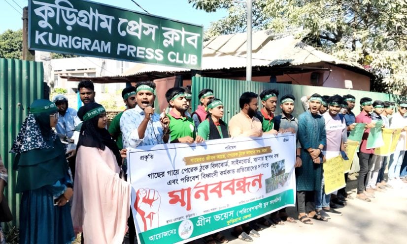 বুধবার (১৯ নভেম্বর) সকালে কুড়িগ্রাম প্রেসক্লাবের সামনে পরিবেশবাদী যুব সংগঠন গ্রিন ভয়েস এই মানববন্ধনের আয়োজন করে।