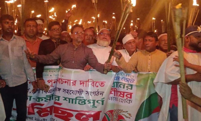 ব্রাহ্মণবাড়িয়া: ব্রাহ্মণবাড়িয়া-৪ (কসবা-আখাউড়া) আসনে বিএনপি ঘোষিত মনোনয়ন পরিবর্তনের দাবিতে আখাউড়ায় মশাল মিছিল হয়েছে। মনোনয়নবঞ্চিত বিএনপি নেতা কবির আহমেদ ভূঁইয়ার কর্মী-সমর্থকেরা মিছিলে কাফনের কাপড় পরে অংশ নেন। পরে মিছিলটি নারায়ণপুর মোড়ে গিয়ে বিক্ষোভ সমাবেশে রূপ নেয়।