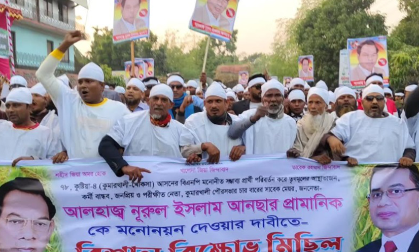 কুষ্টিয়া: কুষ্টিয়া-৪ (কুমারখালী-খোকসা) আসনে মনোনয়ন পরিবর্তন করে কুমারখালী উপজেলা বিএনপির সভাপতি নুরুল ইসলাম আনছার প্রামানিককে প্রার্থী ঘোষণার দাবিতে কাফনের কাপড় পরে বিক্ষোভ মিছিল করেছে দলের একাংশের নেতাকর্মীরা।