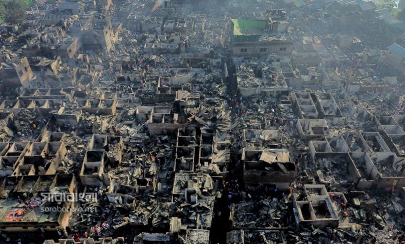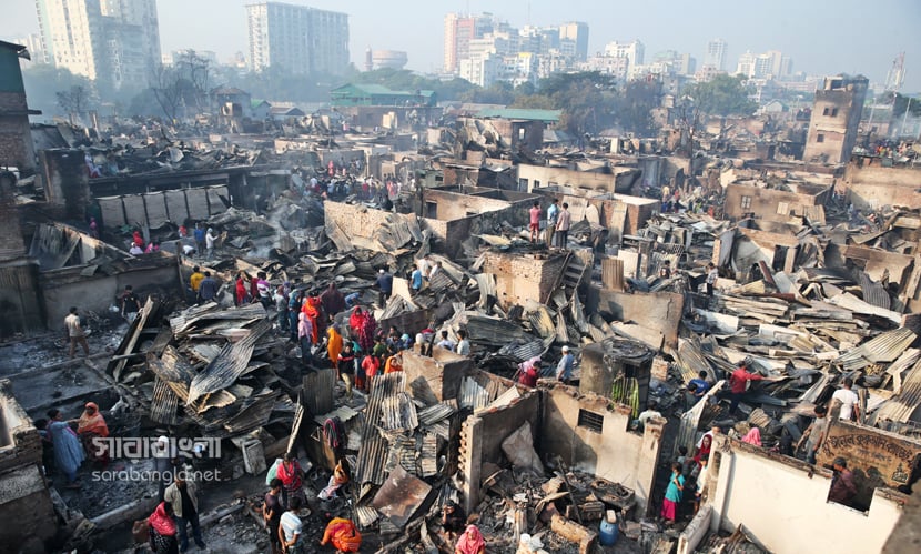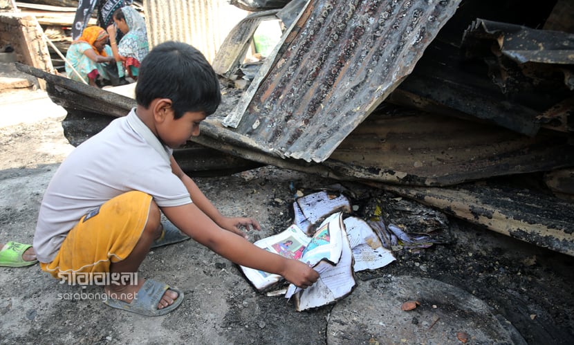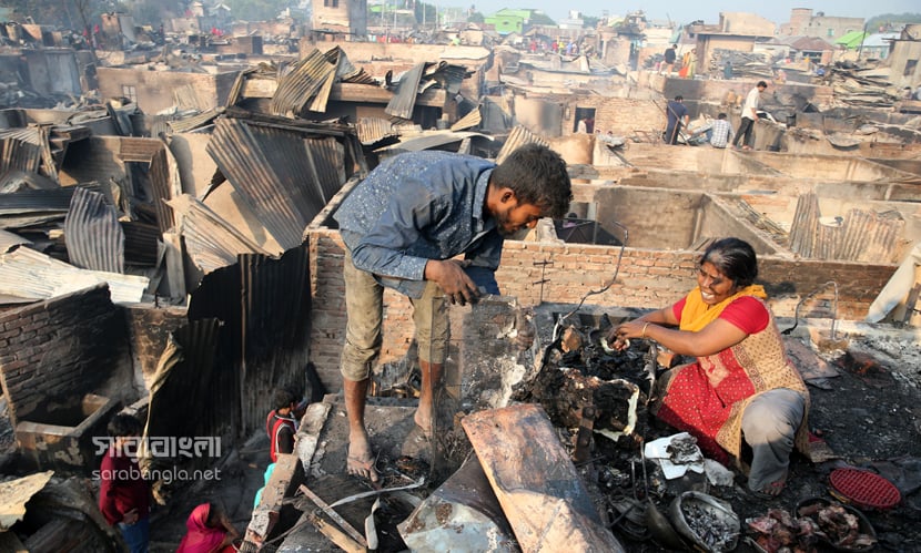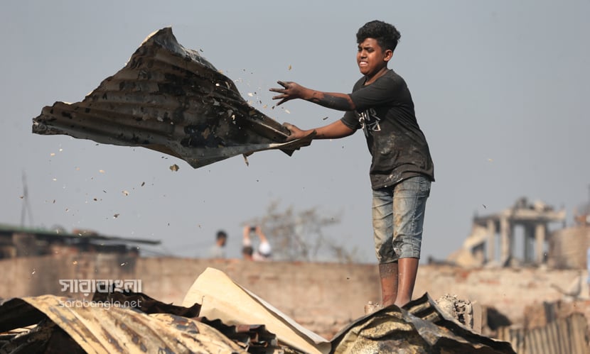 কড়াইল বস্তিতে আগুনে পুড়ে ছাই হয়ে গেছে কয়েকশ’ ঘর। আসবাবপত্র কিছুই যেন অবশিষ্ট নেই। পরিবার নিয়ে খোলা আকাশের নিচে ঠাঁই হয়েছে সবার। কেউ কেউ আগুনে পোড়া ধ্বংসস্তূপের মাঝে টিন ও লোহালক্কর খুঁজছেন। কেউ আবার নতুন করে স্বপ্ন বোনার আশায় পুড়ে যাওয়া ঘরের ধ্বংসস্তূপ পরিষ্কার-পরিচ্ছন্ন করছেন। এই কয়েক মুহূর্তের মধ্যেই সব যেন মেনে নিয়েছেন তারা। সহায়-সম্বল হারানো মানুষগুলোর চোখে-মুখে তাই ফের ঘর বানানোর স্বপ্ন উঁকি দিচ্ছে। আগুন নির্বাপণের পর কড়াইল বস্তি ঘুরে ছবিগুলো ফ্রেমবন্দি করেছেন সারাবাংলার সিনিয়র ফটোকরেসপন্ডেন্ট হাবিবুর রহমান।