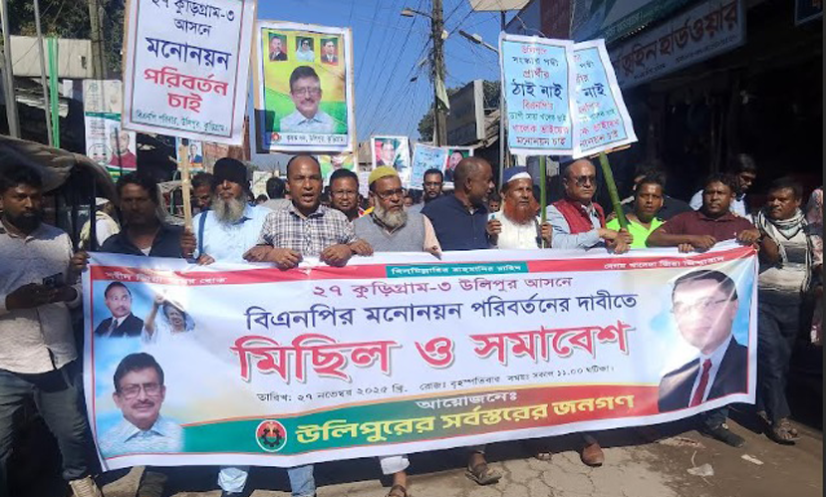বৃহস্পতিবার (২৭ নভেম্বর) সকালে ‘উলিপুরের সর্বস্তরের জনগণ’-এর ব্যানারে এই কর্মসূচি পালিত হয়। এতে স্থানীয় রাজনৈতিক কর্মী, ব্যবসায়ী, শিক্ষক-শিক্ষার্থী, দিনমজুর, কৃষকসহ বিভিন্ন শ্রেণি-পেশার মানুষ স্বতঃস্ফূর্তভাবে যোগ দেন।