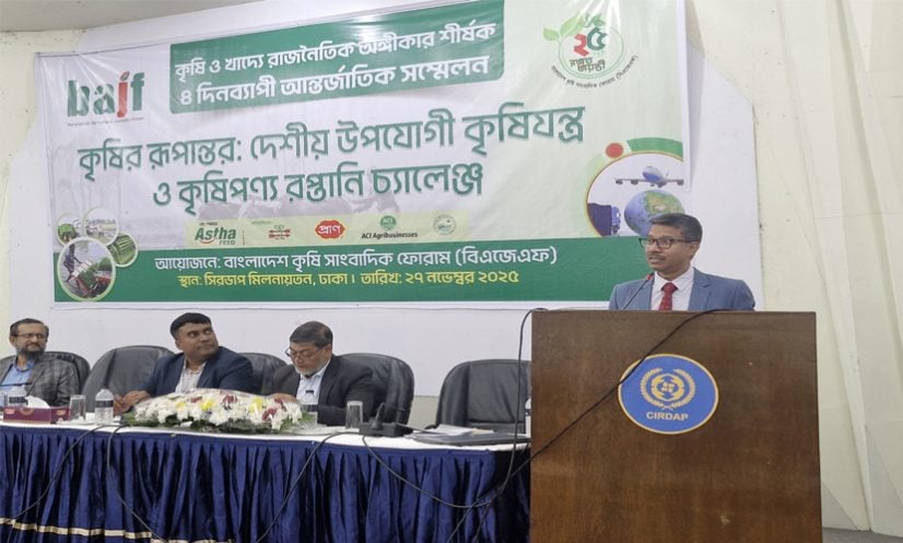 বৃহস্পতিবার (২৭ নভেম্বর) রাজধানীর সিরডাপ মিলনায়তনে বাংলাদেশ কৃষি সাংবাদিক ফোরাম (বিএজেএফ) আয়োজিত চার দিনব্যাপী ‘কৃষি ও খাদ্যে রাজনৈতিক অঙ্গীকার’ শীর্ষক আন্তর্জাতিক সম্মেলনের উদ্ভোধনী ‘কৃষির রূপান্তর: দেশীয় উপযোগী কৃষিযন্ত্র ও কৃষিপণ্য রপ্তানি চ্যালেঞ্জ’ সেমিনারে এসব কথা বলেন কৃষি সচিব। বিএজেএফ-এর সাধারণ সম্পাদক আবু খালিদের সঞ্চালনায় এতে সভাপতিত্ব করেন সংগঠনটির সভাপতি সাহানোয়ার সাইদ শাহীন।