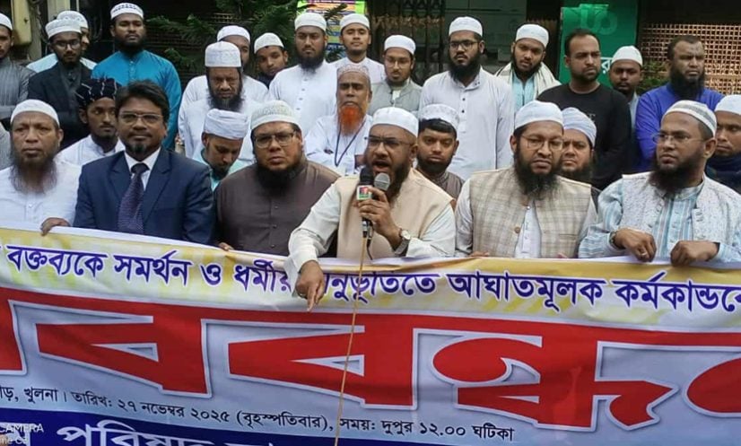 বৃহস্পতিবার (২৭ নভেম্বর) দুপুরে পিকচার প্যালেস মোড়ে খুলনায় “জাতীয় ইমাম পরিষদ বাংলাদেশ” খুলনা মহানগর শাখার উদ্যোগে আয়োজিত মানববন্ধনে প্রধান অতিথির বক্তব্যে তিনি এসব কথা বলেন।