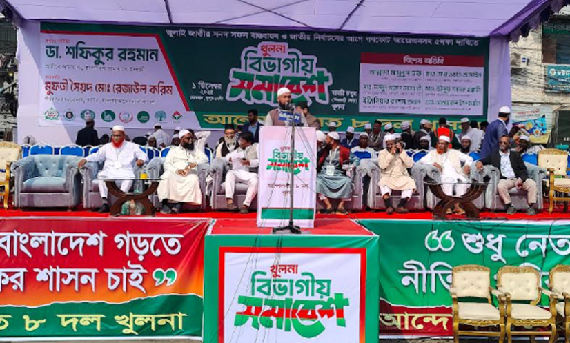 খুলনা: জুলাই জাতীয় সনদ সফল বাস্তবায়ন ও জাতীয় নির্বাচনের আগে গণভোট আয়োজনসহ ৫ দফা দাবিতে খুলনার শিববাড়ী মোড় বাবরী চত্বরে ৮ দলের বিভাগীয় সমাবেশ শুরু হয়েছে।