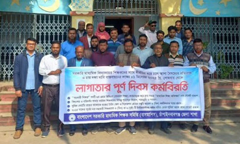 চাঁপাইনবাবগঞ্জ: সরকারি মাধ্যমিক বিদ্যালয়ের শিক্ষকদের দীর্ঘদিনের বৈষম্য দূরীকরণ ও চার দফা দাবি বাস্তবায়নের দাবিতে সোমবার (১ ডিসেম্বর) থেকে চাঁপাইনবাবগঞ্জসহ সারাদেশে লাগাতার পূর্ণদিবস কর্মবিরতি শুরু করেছেন শিক্ষকরা। বাংলাদেশ সরকারি মাধ্যমিক শিক্ষক সমিতি (বাসমাশিস) চাঁপাইনবাবগঞ্জ জেলা শাখার উদ্যোগে এই কর্মবিরতির ঘোষণা দেওয়া হয়।
