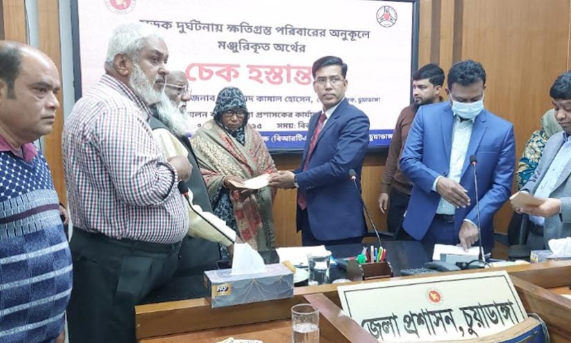 রোববার (৭ ডিসেম্বর) বিকেল সাড়ে ৪টায় চুয়াডাঙ্গা জেলা প্রশাসকের সম্মেলন কক্ষে জেলা প্রশাসক মোহাম্মদ কামাল হোসেন প্রধান অতিথি হিসেবে উপস্থিত থেকে আনুষ্ঠানিকভাবে ক্ষতিগ্রস্ত ১৪টি পরিবারের সদস্যদের হাতে ৬৪ লাখ টাকার চেক তুলে দেন।