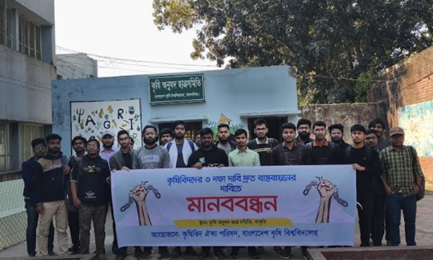 বুধবার (১০ ডিসেম্বর) বিশ্ববিদ্যালয়ের প্রধান ফটকের সামনে এ মানববন্ধন কর্মসূচি হয়।