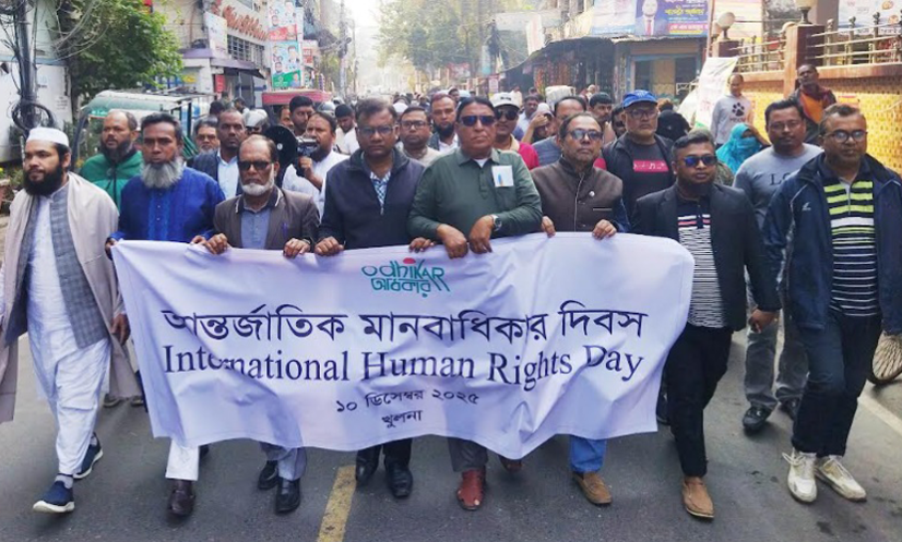 বুধবার (১০ ডিসেম্বর) দুপুরে আন্তর্জাতিক মানবাধিকার দিবস-২০২৫ উপলক্ষ্যে মানবাধিকার সংগঠন ‘অধিকার’ খুলনা ইউনিটের উদ্যোগে খুলনা প্রেসক্লাবের সামনে অনুষ্ঠিত মানববন্ধন কর্মসূচি ও র্যালিতে অংশ নিয়ে বক্তারা এসব কথা বলেন।