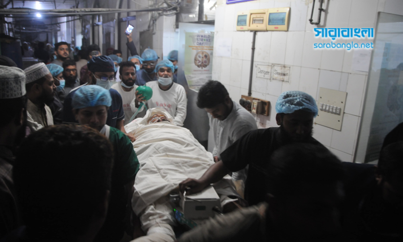 তিনি বলেন, ‘গুলি উনার কানের ডান দিক দিয়ে ঢুকে বাম দিয়ে বের হয়ে গেছে। বুলেট ইনজুরি হয়েছে। বুলেট যেদিক দিয়ে ঢুকে সেদিকে ইনজুরি ছোট হয়, যেদিক দিয়ে বের হয় বড় ইনজুরি হয়, সেটাই হয়েছে। ব্রেন ইনজুরি হচ্ছে, ব্রেন ফুলে ফেপে যায়, প্রেসার বেড়ে যায়। এটা অত্যন্ত ক্ষতিকারক। এটা যাতে না হয়, সেজন্য নিউরো সার্জনরা যারা ছিলেন- ডা. জাহিদ রায়হান ও তার টিম ব্রেনের খুলিটা বড় করে খুলে দিয়েছেন, যাতে প্রেসার না বাড়ে।’