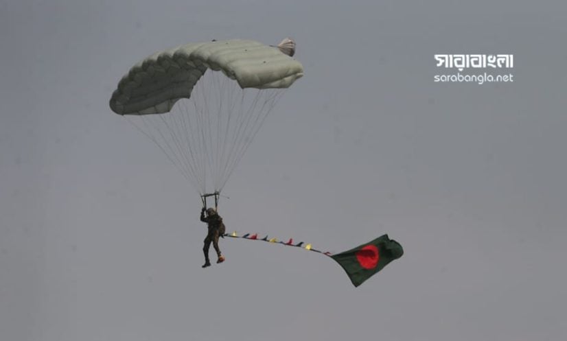 ঢাকা: মহান বিজয় দিবস উপলক্ষে রাজধানীর জাতীয় প্যারেড স্কয়ারে সশস্ত্র বাহিনীর মনোজ্ঞ ফ্লাই পাস্ট, প্যারাজাম্প এবং বিশেষ এ্যারোবেটিক প্রদর্শনী অনুষ্ঠিত হয়েছে। আর এটি একটি গিনেস ওয়ার্ল্ড রেকর্ড।