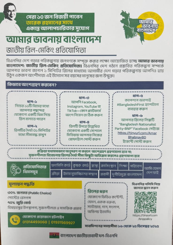 সংবাদ সম্মেলনে জানানো হয়, প্রতিযোগিতায় অংশগ্রহণকারীরা এক মিনিটের ভিডিও (রিল) তৈরি করে বাংলাদেশের ভবিষ্যৎ নিয়ে নিজেদের ভাবনা তুলে ধরতে পারবেন। রিলগুলোতে কর্মসংস্থান, শিক্ষা, স্বাস্থ্য, কৃষি, দুর্নীতিমুক্ত রাষ্ট্র, সুশাসন, প্রবাসীদের অধিকার, পরিবেশ সংরক্ষণসহ বিভিন্ন গুরুত্বপূর্ণ জাতীয় ইস্যু তুলে ধরার আহ্বান জানানো হয়েছে।