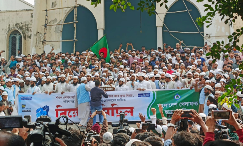 ঢাকা: জুলাই আন্দোলনের সম্মুখসারির সংগঠক ও ইনকিলাব মঞ্চের মুখপাত্র শরিফ ওসমান হাদিকে গুলি করে হত্যার ঘটনায় জড়িতদের বিচারের দাবিতে জাতীয় মসজিদ বায়তুল মোকাররমে বিক্ষোভ সমাবেশ করা হয়।শুক্রবার (১৯ ডিসেম্বর) দুপুরে জুমার নামাজ শেষে ‘ওসমান হাদির ওপর হামলাকারীদের গ্রেফতার করে দ্রুত বিচার, অবৈধ অস্ত্র উদ্ধার ও লীগ সন্ত্রাসীদের গ্রেফতার দাবি’- শীর্ষক ব্যানারে বিক্ষোভ কর্মসূচি শুরু করে বাংলাদেশ খেলাফত ছাত্র মজলিস। এছাড়া, সাধারণ মুসল্লিরা এতে অংশ নেন।