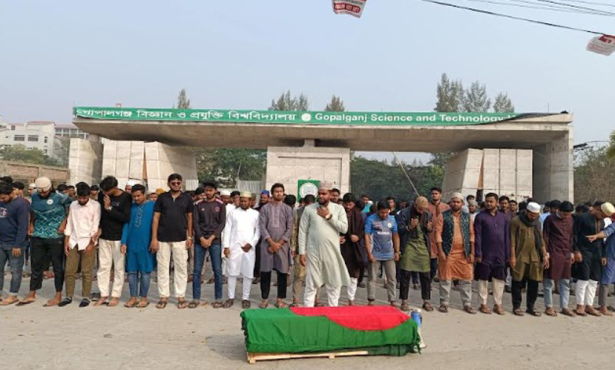 এসময় গায়েবানা জানাজা নামাজে জেলা বিএনপির ভারপ্রাপ্ত সাধারণ সম্পাদক মোশারফ হোসেন, জেলা বিএনপির সহ-সভাপতি মাফতুন আহম্মেদ খান রুবেল, সাংগঠনিক সম্পাদক শহিদ উন-নবী সালাম, শহর জামায়াতের সেক্রেটারি অধ্যাপক আ স ম আবদুল মালেক, জেএসডি নেতা রেজাউল বারী দিপন, জুলাই যোদ্ধাসহ বিভিন্ন দলের নেতাকর্মীসহ সাধারণ ছাত্র-জনতার ঢাল নামে।