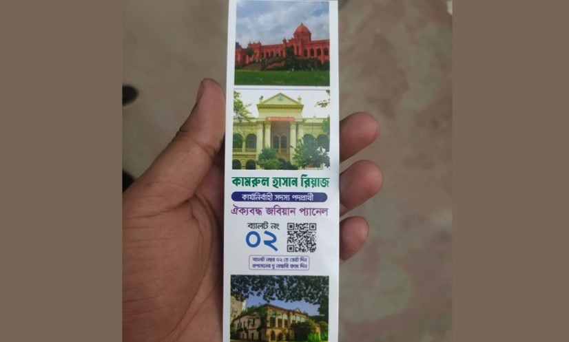 জাতীয় ছাত্রশক্তি সমর্থিত ‘ঐক্যবদ্ধ জবিয়ান প্যানেল’-এর কার্যনির্বাহী সদস্য পদপ্রার্থী কামরুল হাসান রিয়াজ রঙিন ছবি সংবলিত প্রচারপত্র বিতরণ করছেন। শুধু তাই নয়, একই প্যানেলের সমাজসেবা ও শিক্ষার্থী কল্যাণ সম্পাদক পদপ্রার্থী তার প্রচারপত্রে শেখ হাসিনার ছবি ব্যবহার করেছেন বলে অভিযোগ উঠেছে। বিধিমালার ৭ (খ) ধারা অনুযায়ী এটি স্পষ্টভাবে নিষিদ্ধ হলেও প্রকাশ্যে এমন প্রচারণা চালানোয় শিক্ষার্থী ও পর্যবেক্ষকদের মধ্যে প্রশ্ন উঠেছে।