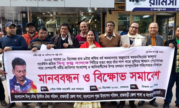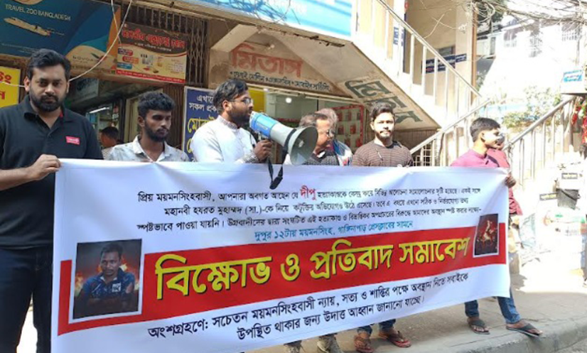 ময়মনসিংহ: ধর্ম অবমাননার মিথ্যা অভিযোগে ভালুকায় দীপু চন্দ্র দাসকে হত্যার সঙ্গে জড়িতদের গ্রেফতার ও দৃষ্টান্তমূলক শাস্তির দাবিতে ময়মনসিংহে মানববন্ধন অনুষ্ঠিত হয়েছে।